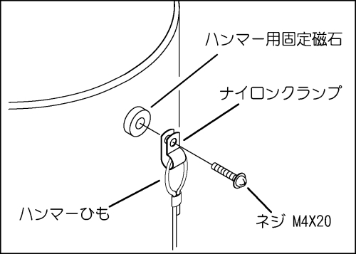 ナイロンクランプにハンマーひもを通し、添付してるネジ(M4X20)で留めてください。 *外した星型ネジは使用しません。 |